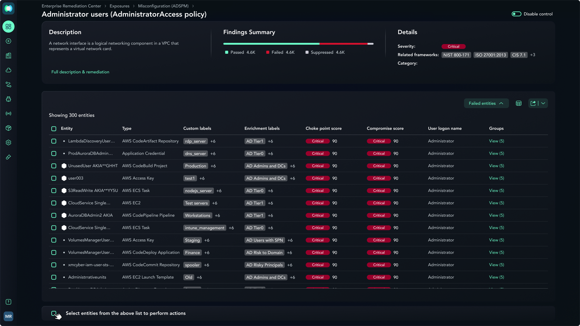 By measuring different hygiene and security metrics across your accounts, the system categorizes controls by status and severity, allowing you to prioritize remediations that minimize operational disruptions and breach risks. This approach moves beyond simple compliance checkboxes, providing a continuous, objective rating of your cyber defense that excludes disabled controls to ensure your “defense score” reflects the actual hardened state of your infrastructure.