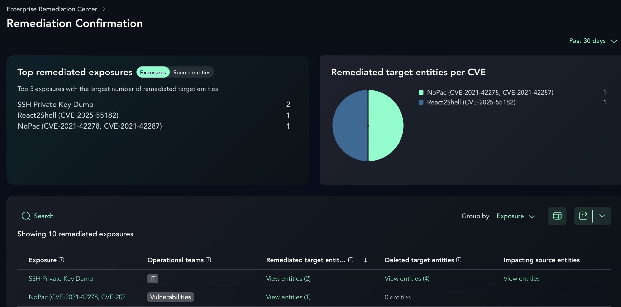 While certain user-behavior exposures, such as SSH Session Hijackers or External Drive Injectors, require manual oversight due to their unpredictable nature, the platform provides clear tracking for the vast majority of exposures. By allowing users to group remediation data by Exposure, Target, or Source entity, the report replaces speculation with a validated audit trail of actual risk reduction.